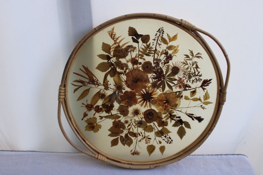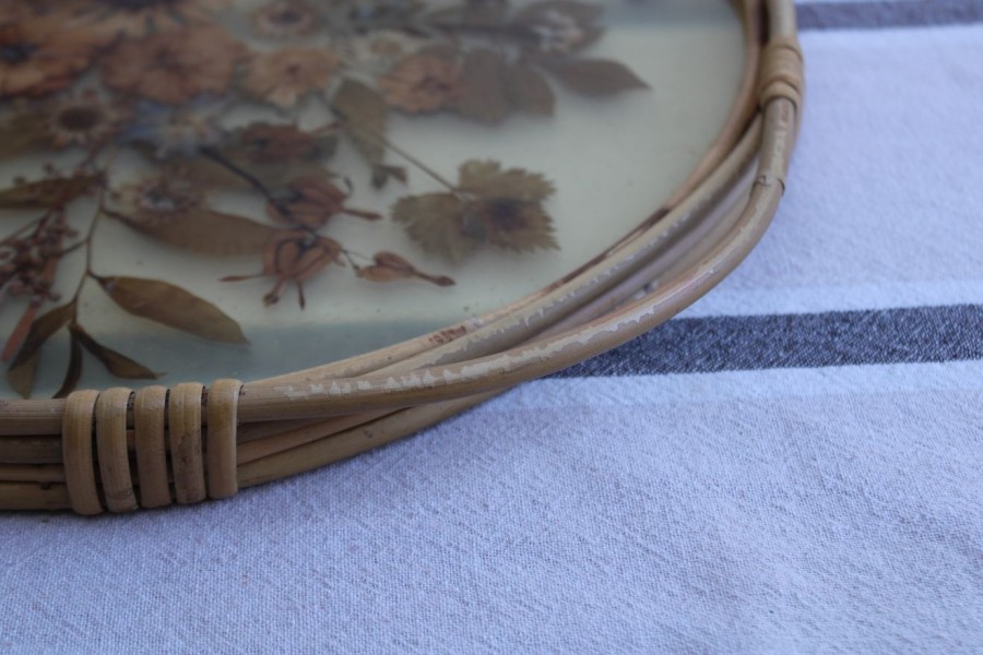 Muni de fines poignées sur le côté, ce plateau en osier offre une bonne dose de nature. Les différents motifs floraux et végétaux insérés prennent pleinement possession du centre et sont véritablement évocateurs d'un paysage bucolique. Ce plateau, tel un bouquet des champs, apportera une touche bohême au moment de servir !
