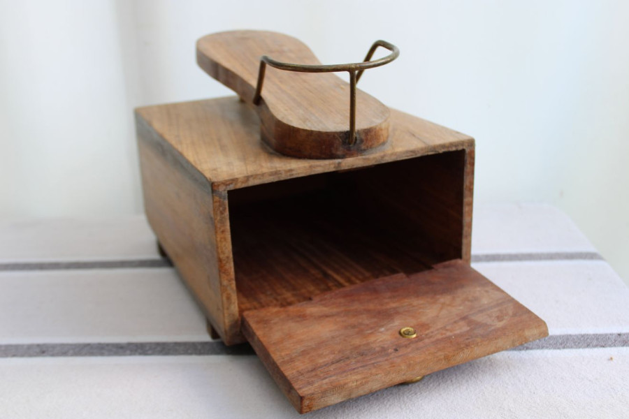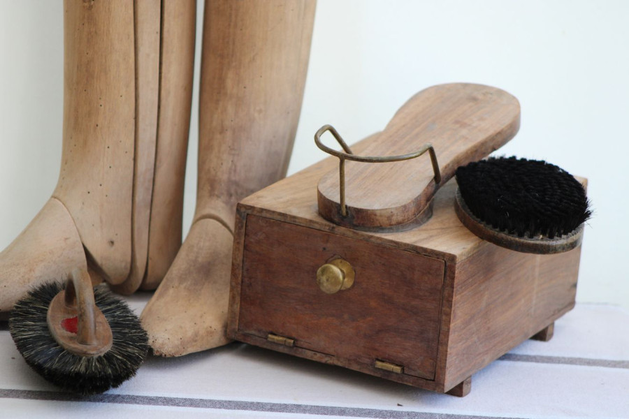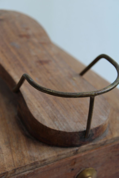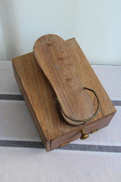 De forme rectangulaire, cette boîte à cirage en bois a fier allure. Subtilement travaillée avec le repose-chaussure et le compartiment pour ranger brosses et cirages, cette boîte saura retrouver sa vocation d'origine .....pour des souliers bien vernis !